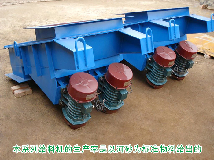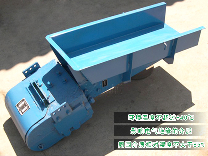 本系列電機振動給料機的生產率是以河砂為標準物料給出的(堆比重為1.6T/m3)。當物料堆比重大于1.6T/m3時,其產量可按額定值選取;當物料的堆比重在1.2~1.6T/m3時,其產量可達到額定產量的0.9~1.0倍。當物料堆比重在0.8~1.2T/m3時其產量可過到額定值的0.8~0.9倍。物料堆比重小于1.6T/m3時,須適當增加料層厚度,以提高產量。對于振動給料機難于輸送的物料(如滑石粉、鈦白粉、白泥、面粉、粘土等),以及含水量較大的親水性物料,則應根據試驗確定產量。必要時將槽體適當傾斜安裝(一般向下傾斜10~15度),以增加給料量。