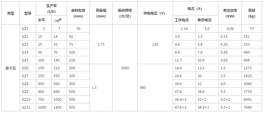GZ電磁振動給料機的價格是型號來制定的,型號越大的GZ電磁振動給料機價格就會越貴,而型號是由生產率、給料粒度等數據決定,具體技術參數如下: