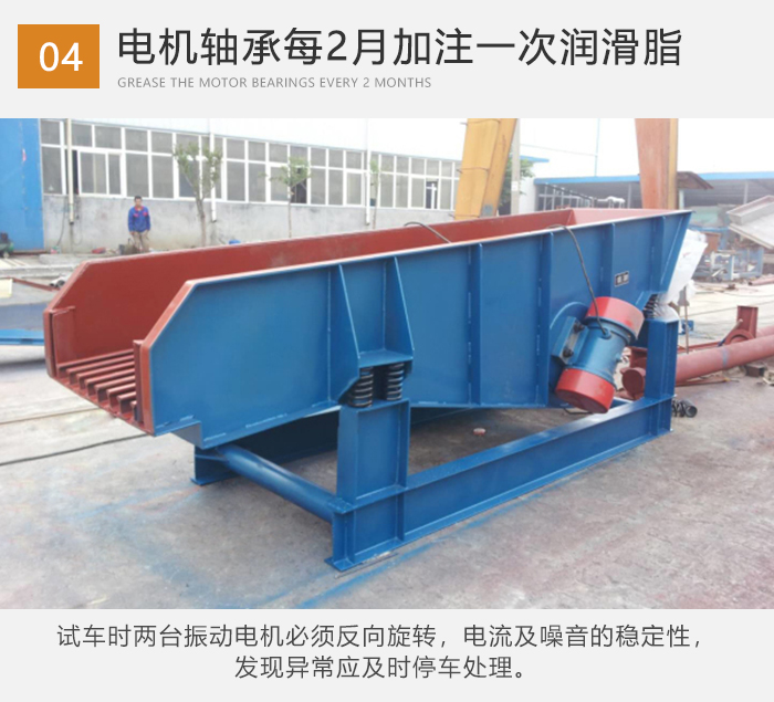 ⒊空試前,應(yīng)將全部螺栓緊固一次,尤其是振動電機的地腳螺栓,連續(xù)運轉(zhuǎn)3-5小時應(yīng)重新緊固一次。